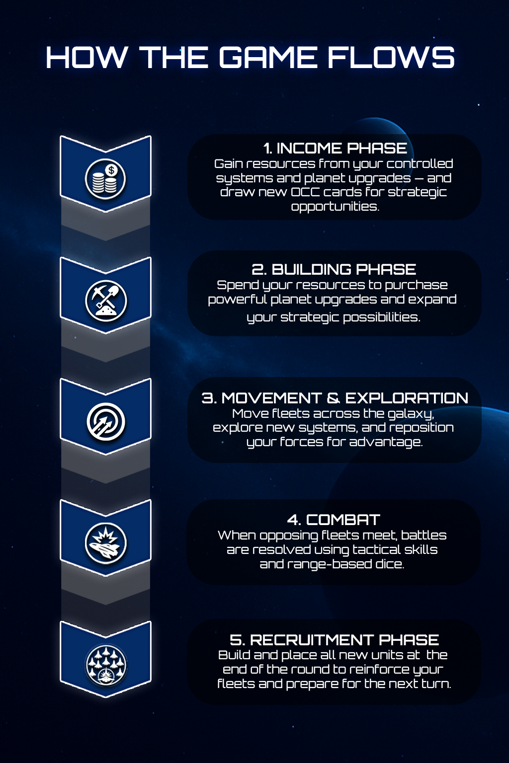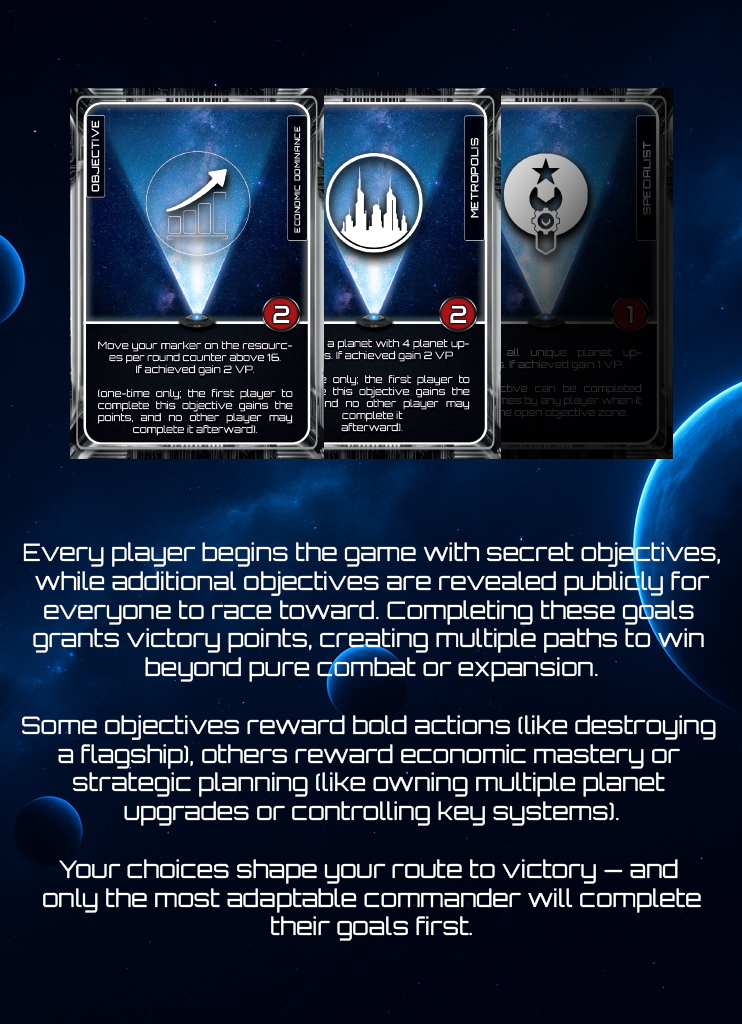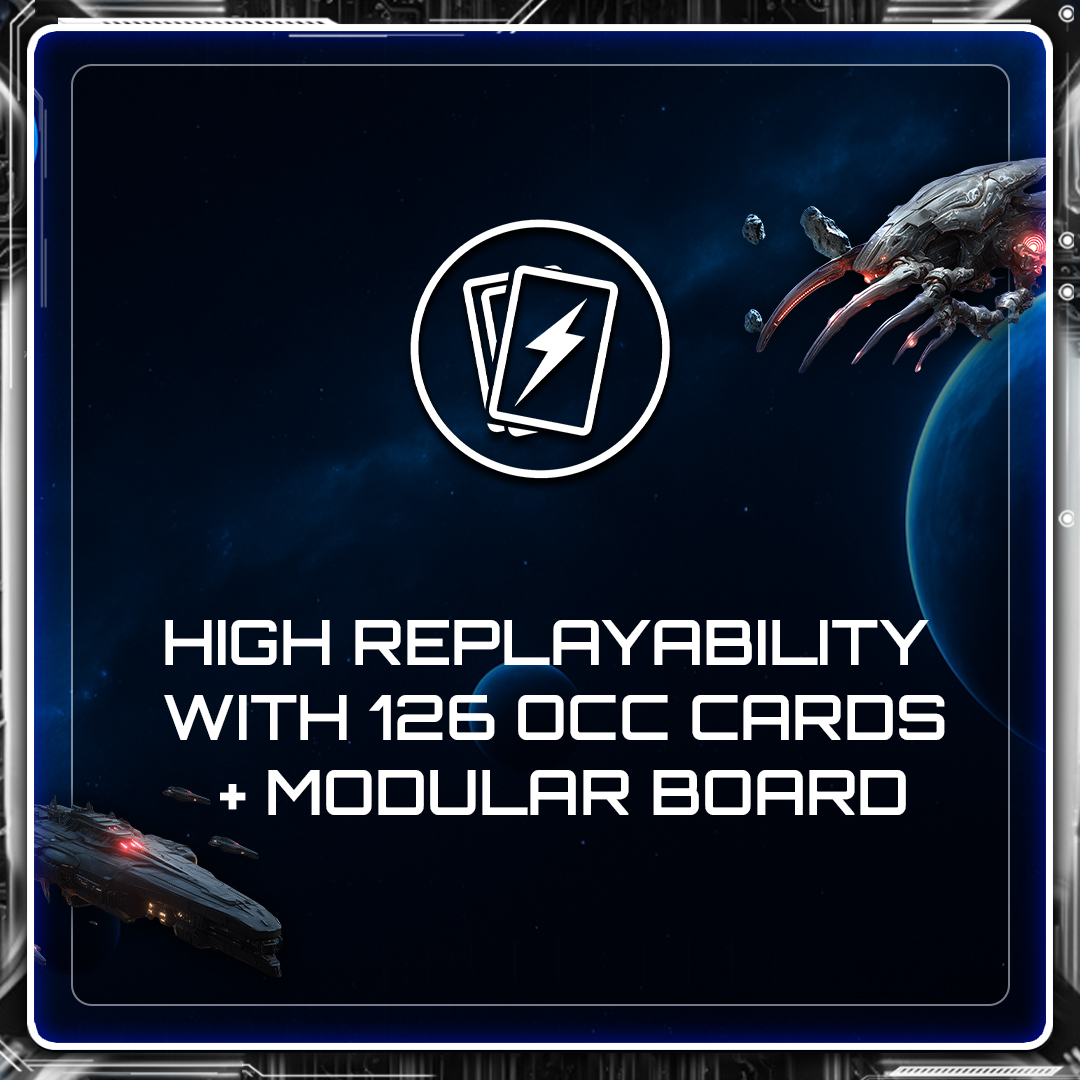 At the start of the game, players form predetermined alliances (e.g., 1–3–5 vs. 2–4–6). Allied players may support each other in battle: when one ally is attacked, the others may send up to 4 units from a single fleet as reinforcements. Winning a battle together grants any supporting player a reward of 3 resources and 1 OCC card, making coordinated defense and timing essential. Alliances are structured — but how and when you support each other remains a tactical choice.