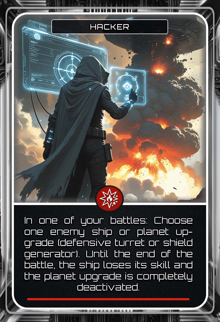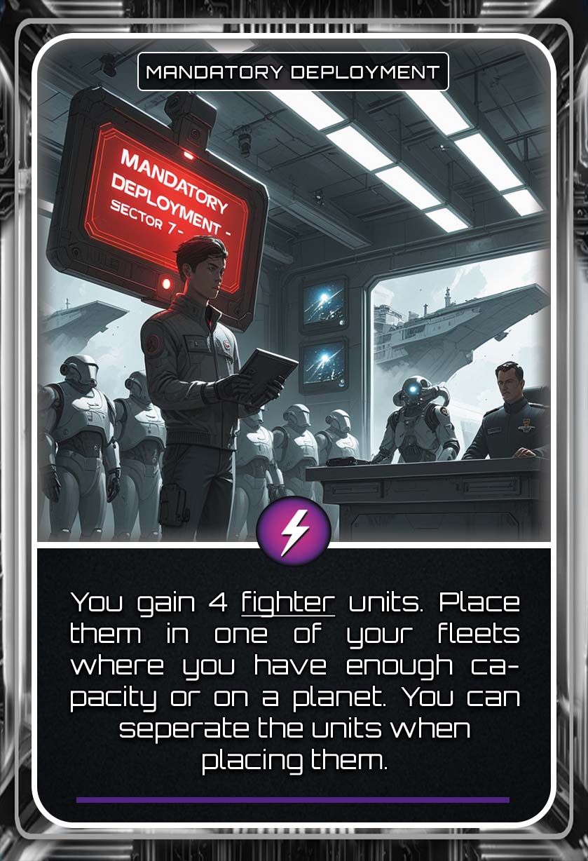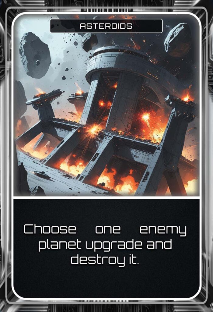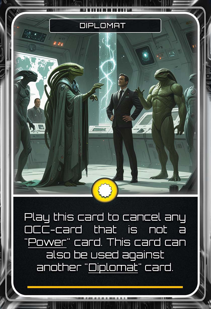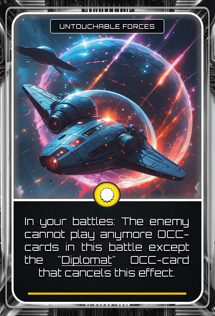 Unleash the power of Occurrence Cards (OCC) and dive into a dynamic deck of 126 OCC cards, featuring over 40 unique effects, that can dramatically shift the course of the game. Gain valuable resources, call in reinforcements, disable enemy abilities, destroy planet upgrades, or surge across the galaxy with unexpected bursts of movement.